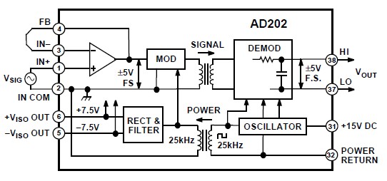 AD202KN general specifications: (1)Max lsolation Voltage (Input to Output)AC, 60 Hz, Continuous: 1500 V; Continuous (AC and DC): ±2000V peak; (2)Isolation-Mode Rejection Ratio (IMRR) @ 60 Hz RS ≤ 100 Ω (HI & LO lnputs) G = 1 V/V: 105dB; (3)Frequency response Bandwidth (VO ≤ 10 V p-p, G = 1 V–50 V/V): 2KHz; (4)Voltage, Rated Performance: +15 V ±5%; (5)Voltage, Operating: +15 V ±10%; (6)Current, No Load (VS = +15 V): 5 mA.