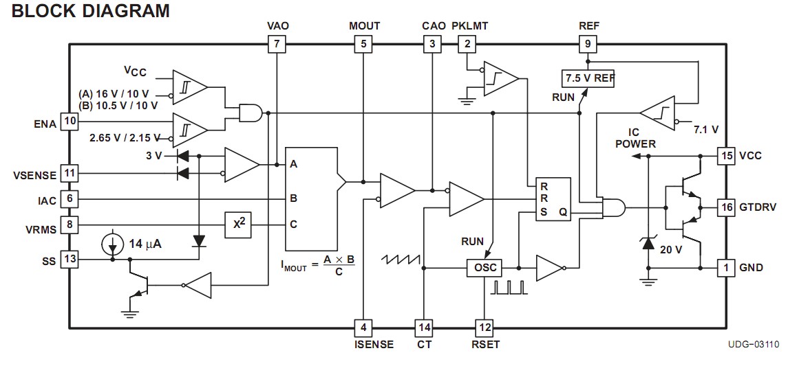 UC2854BDW features: (1)Controls Boost PWM to Near-Unity Power Factor; (2)Limits Line Current Distortion To < 3%; (3)World-Wide Operation Without Switches; (4)Accurate Power Limiting; (5)Fixed-Frequency Average Current-Mode Control; (6)High Bandwidth (5 MHz), Low-Offset Current Amplifier; (7)Integrated Current- and Voltage Amplifier Output Clamps; (8)Multiplier Improvements: Linearity, 500 mV; (9)VAC Offset (Eliminates External Resistor), 0 V to 5 V Multout Common-Mode Range; (10)VREF GOOD Comparator; (11)Faster and Improved Accuracy ENABLE Comparator; (12)UVLO Options (16 V/10 V or 10.5 V/10 V); (13)300-μA Start-Up Supply Current.