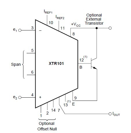 The XTR101AP is a microcircuit, 4-20mA, two-wire transmitter containing a high accuracy instrumentation amplifier (IA), a voltage-controlled output current source, and dual-matched precision current reference. This combination is ideally suited for remote signal conditioning of a wide variety of transducers such as thermocouples, RTDs, thermistors, and strain gauge bridges. State-of-the-art design and laser-trimming, wide temperature range operation and small size make XTR101AP very suitable for industrial process control applications. In addition, the optional external transistor allows even higher precision.